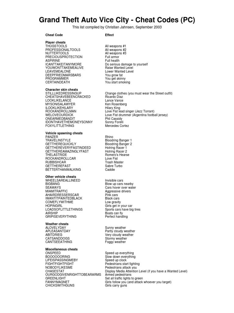 Grand Theft Auto Vice City Cheats And Codes For Pc Gta